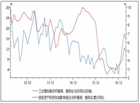 從需求來看,截止 2017 年 4 月,國內(nèi)紡織服裝、服飾業(yè)固定資產(chǎn)投資完成額累計同比增長 10.90%,2017 年 3 月、4 月紡織服裝、服飾業(yè)工業(yè)增加值同比增長 7.00%和 6.30%,行業(yè)需求復(fù)蘇跡象明顯。